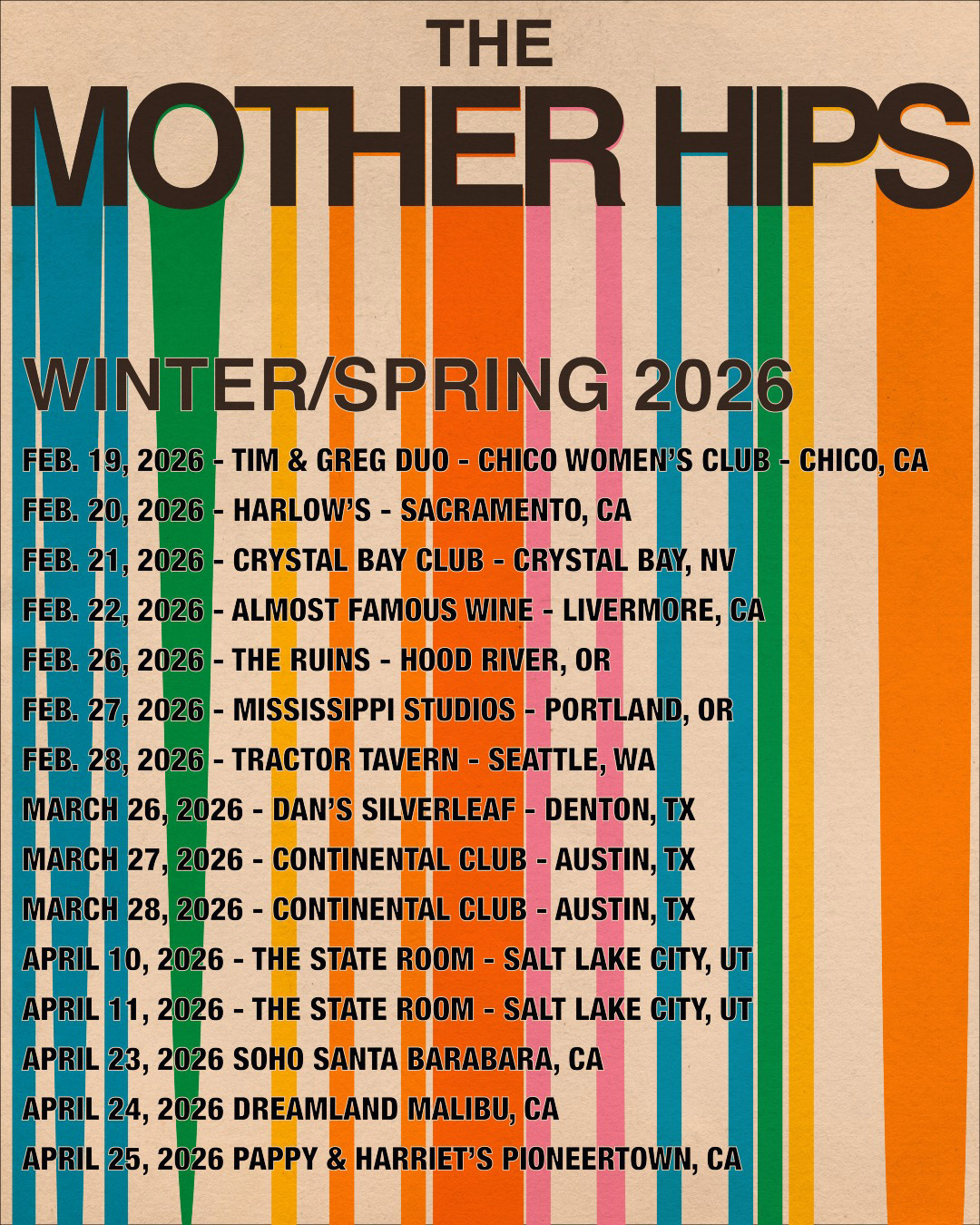 Winter / Spring 2026 Winter Spring 2026 tour dates announced! BUY TICKETS COMMENT mhipsadmin2026-01-30T19:48:27+00:00January 30th, 2026| Related Posts New Music Download: The Ultimate Setlist Show 4 Greg Loiacono & Stingray Single Out Now! Annual Holiday Shows Announced! Hardly Strictly Bluegrass in Golden Gate Park October 3 A Rocky Mountain Hipsmas!